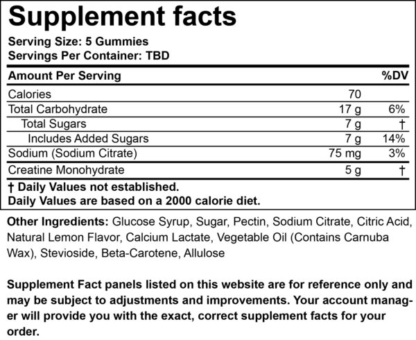 - Provides a potent 1g dose of Creatine Monohydrate per gummy (5g per serving).