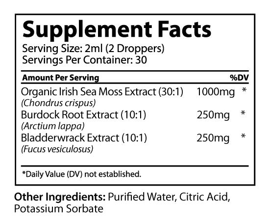 Blending three powerful ingredients: organic Irish Sea Moss, Burdock Root and Fucus Vesicus, these highly concentrated drops are formulated to support thyroid health, metabolic balance, digestive system and immune function. Each serving delivers the synergistic power of marine and herbal extracts to provide consumers with comprehensive nutritional support.