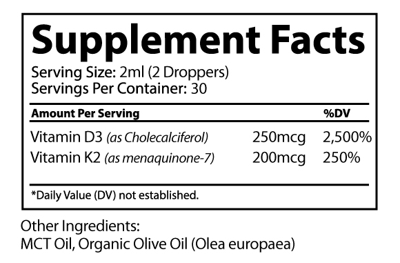 A high-potency liquid formula delivering 250 μg of vitamin D3 and 200 μg of natural MK-7 vitamin K2 per serving. Blended with MCT oil and organic olive oil for enhanced absorption and bioavailability.